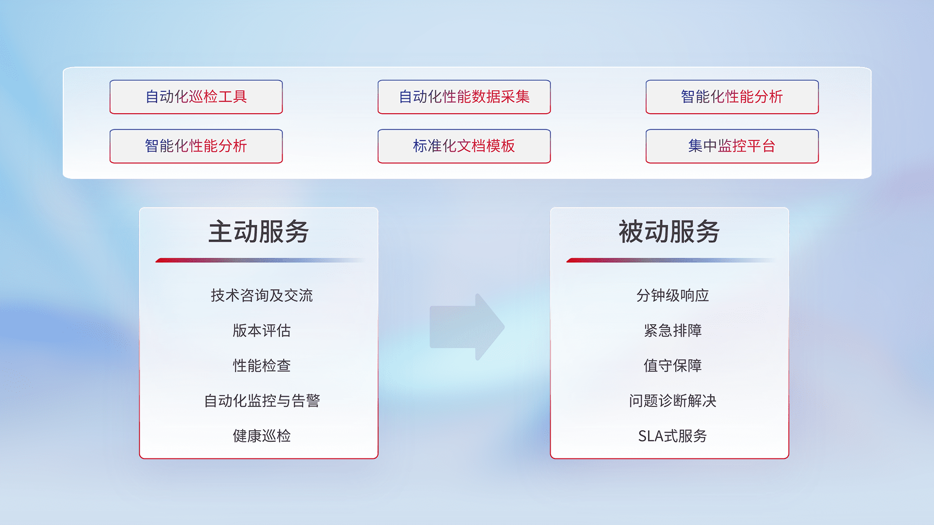 智能化工具和标准化文档,,,保障服务质量,,,提供主动服务(包含技术咨询、、、、版本评估、、、、性能检查、、、、自动化监控与告警、、、健康巡检)和被动服务包含(分钟级响应、、、、紧急排障、、、值守保障、、、问题诊断解决、、、、SLA服务)。。